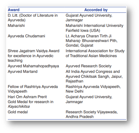 प्रदान की गई प्रशंसा और सम्मान:- प्रसिद्ध आयुर्वेदिक विद्वान पंडित ब्रजबंधु त्रिपाठी शर्मा को आयुर्वेद रत्न की उपाधि से सम्मानित किया गया तथा उन्हें अनेक सम्मान प्राप्त हुए, जिनमें 1970 में ओडिशा साहित्य अकादमी से प्रमाण पत्र मिला, जिसे मुख्यमंत्री हरेकृष्ण महताब ने प्रदान किया था, तथा आयुर्वेद में उनके उत्कृष्ट योगदान के लिए उन्हें चिकित्सक समाज से उत्कल धन्वंतरि पुरस्कार भी मिला।